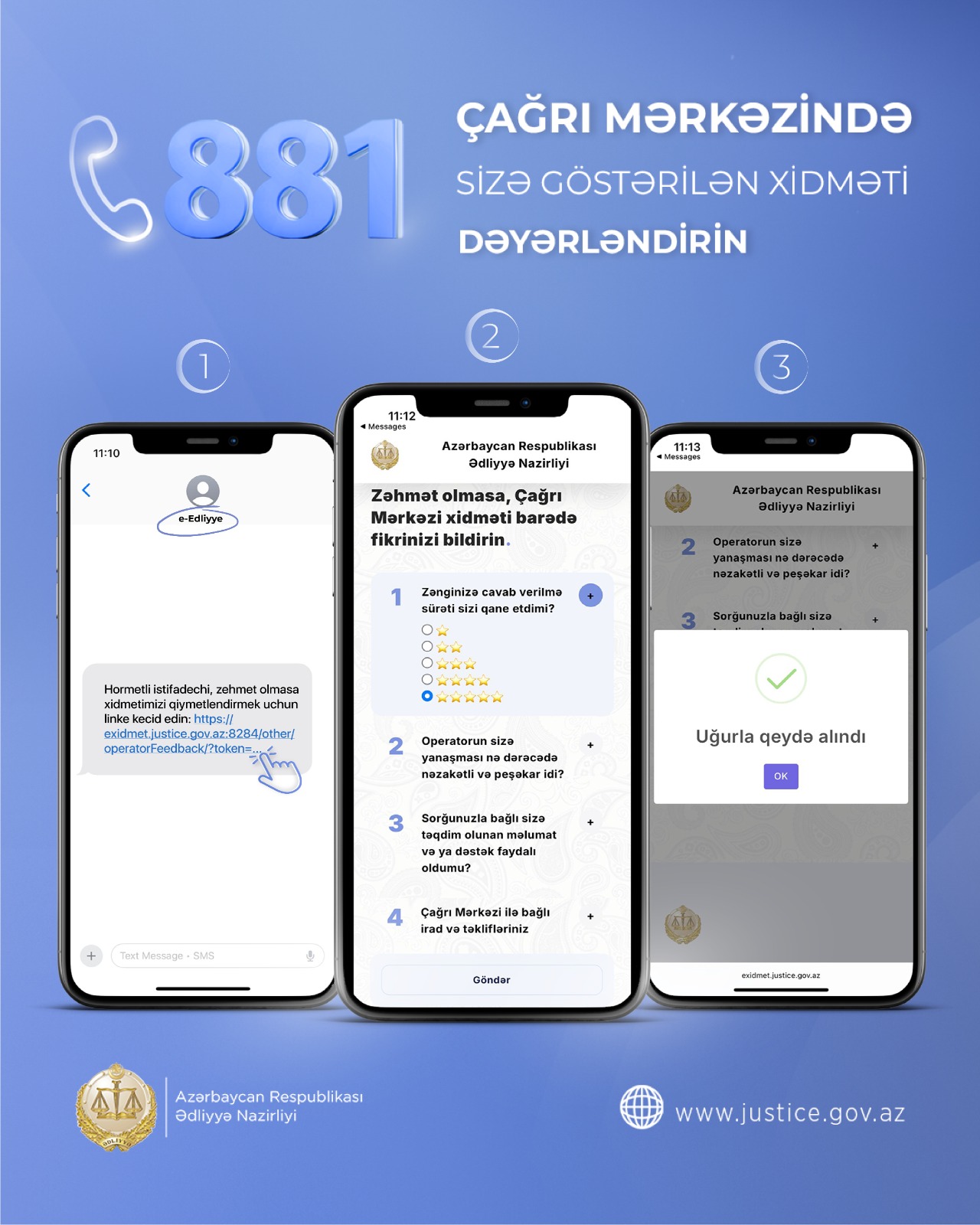Ədliyyə Nazirliyinin “881” Çağrı Mərkəzi müraciətlərin obyektiv araşdırılması və cavablandırılması, fəaliyyətin təkmilləşdirilməsi üçün təhlillərin aparılması və vətəndaş məmnunluğunun artırılmasına xidmət edir.