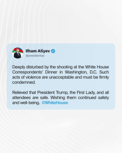 “Belə zorakılıq halları qəbuledilməzdir və qəti şəkildə pislənməlidir. Prezident Trampın, Birinci xanımın və bütün iştirakçıların təhlükəsiz olması sevindiricidir. Onlara davamlı təhlükəsizlik və rifah arzulayıram”, – deyə Dövlət başçısı vurğulayıb.