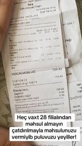 Yeniera.az-a müraciət edən şikayətçi bildirir ki, 9 aprel tarixində filialdan məhsul alaraq çatdırılmasını istəyib və ödənişi nağd şəkildə həyata keçirib.